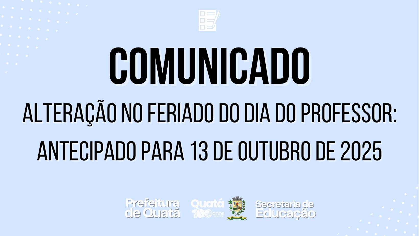 De acordo com a Resolução nº10/2025, "fica antecipado o feriado do Dia do Professor, tradicionalmente comemorado em 15 de outubro, para o dia 13 de outubro de 2025 (segunda-feira), no âmbito da Rede Municipal de Ensino de Quatá".