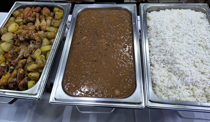 milho, frango com batata, strogonoff de carne e batata palha, servidos com