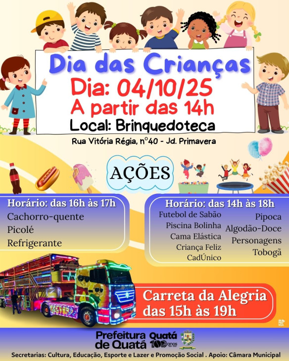 19/09/2025 09:50A Prefeitura de Quatá convida todas as crianças para uma tarde especial em comemoração ao Dia das Crianças, que acontecerá no dia 04 de outubro de 2025, a partir das 14h, na Brinquedoteca, localizada na Rua Vitória Régia, nº 40 - Jardim Primavera.