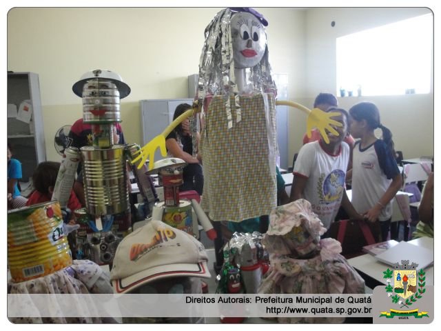 Inspirados no filme Robôs (animação; 2005; Fox; de Chris Wedge); alunos do quinto ano da escola municipal Ozira de Arruda Mendes, do bairro Nova Quatá, como tarefa de criação sugerida pela profa. Adriana Morgado, produziram bonecos-robôs, com material reciclado (latas de refrigerante, de alimentos em conserva; xampu; panelas e outros).