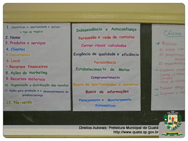 Essa é uma parceria entre a Prefeitura Municipal de Quatá, Secretaria Municipal de Educação, SEBRAE, com o apoio e incentivo da Prefeita Luciana Guimarães Alves Casaca.