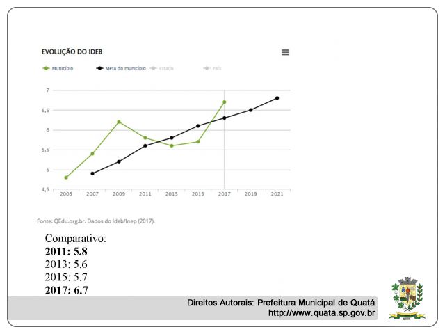 A Secretaria Municipal de Educação de Quatá parabeniza cada profissional de educação envolvido neste processo, desde Diretores e Assessores Pedagógicos até chegar aos Agentes que fazem a aprendizagem ocorrer dentro de cada sala de aula, ou seja, os Professores. Deseja também que este resultado seja motivação para a continuidade de um trabalho sempre pautado pela seriedade e pela responsabilidade em busca de objetivos maiores da educação – contribuir para formação de cidadãos qualificados.