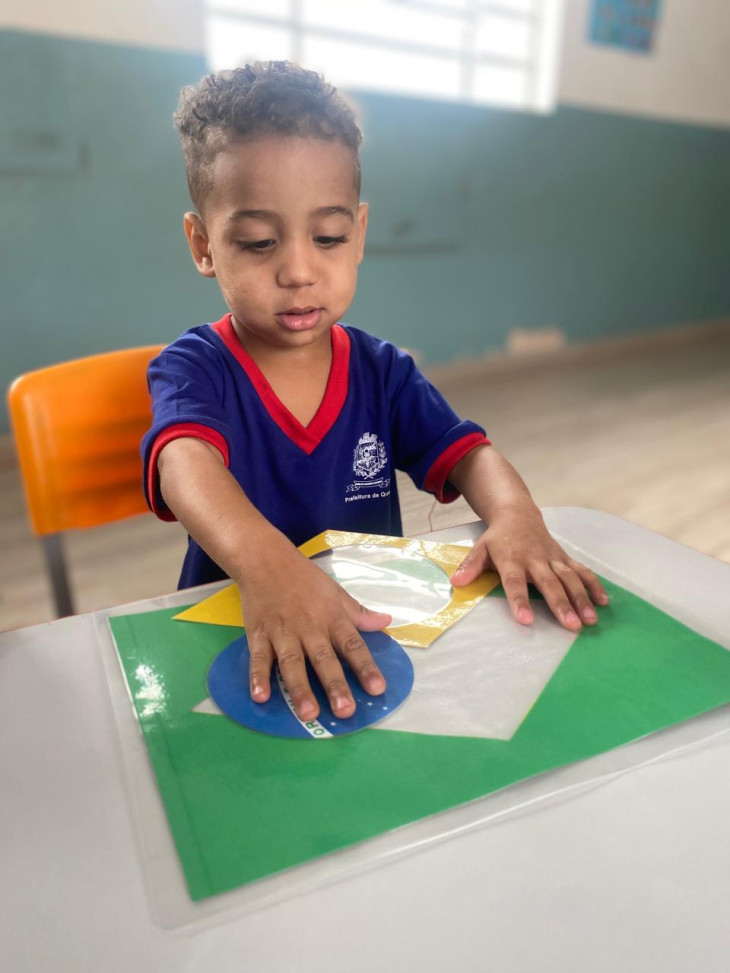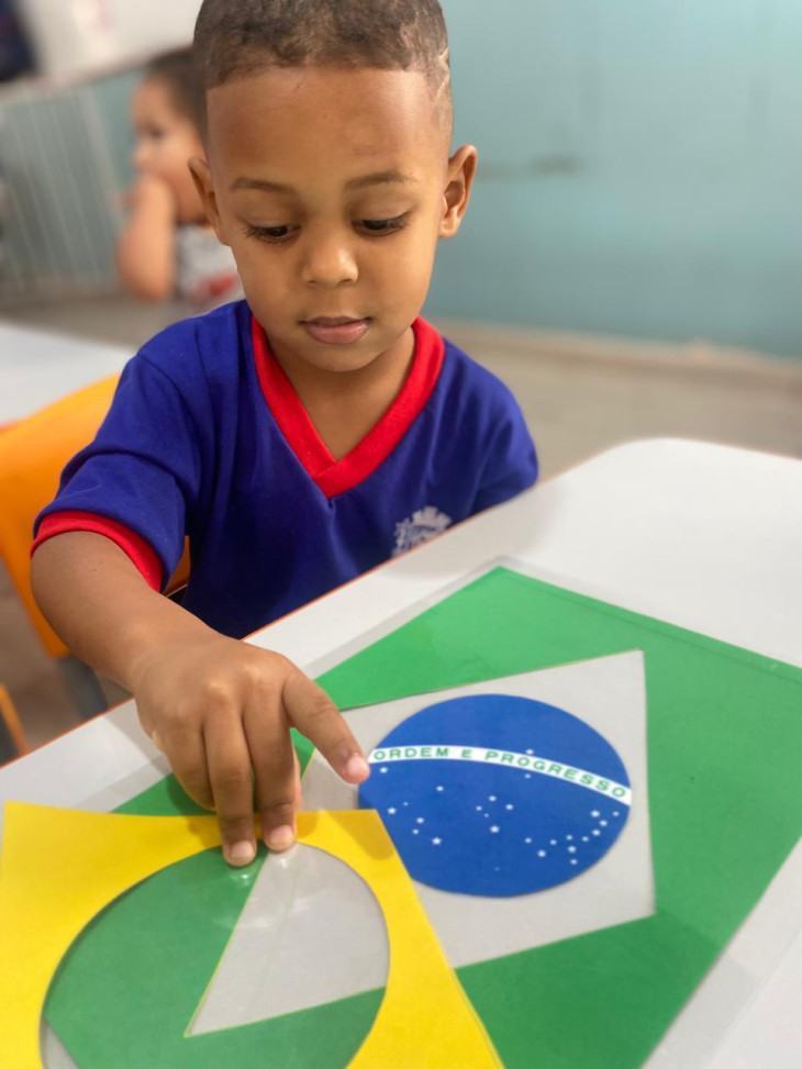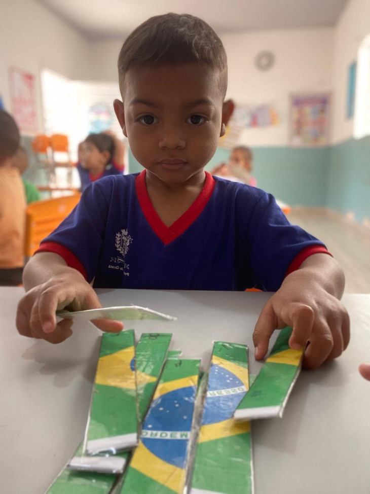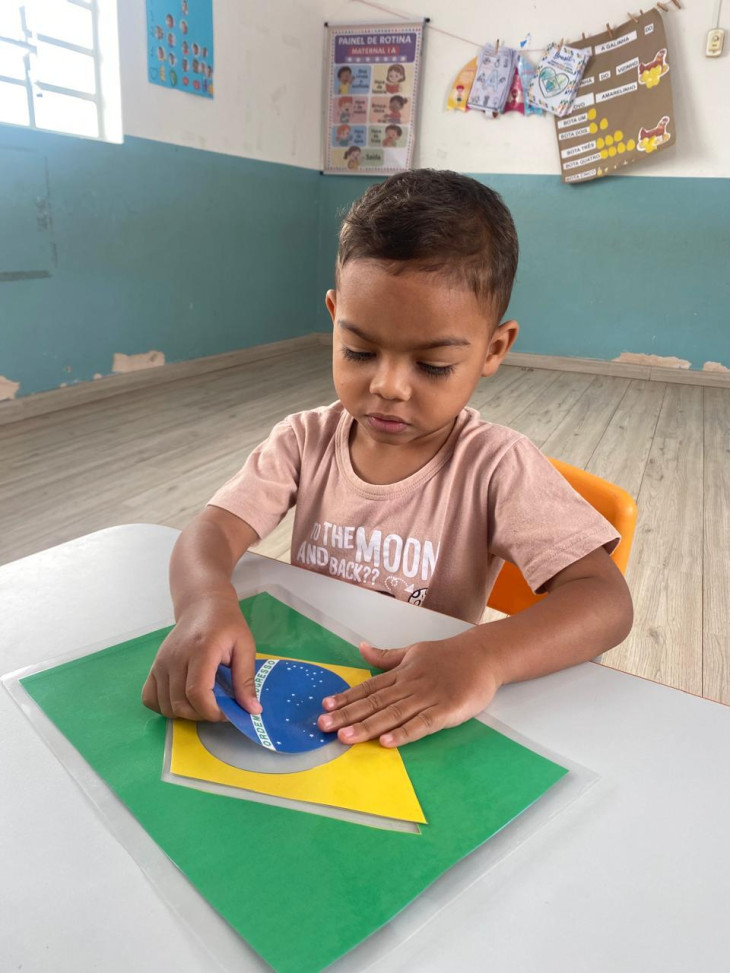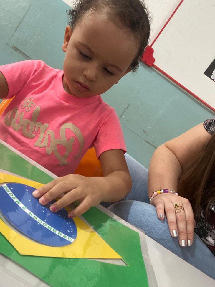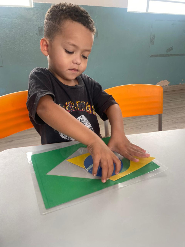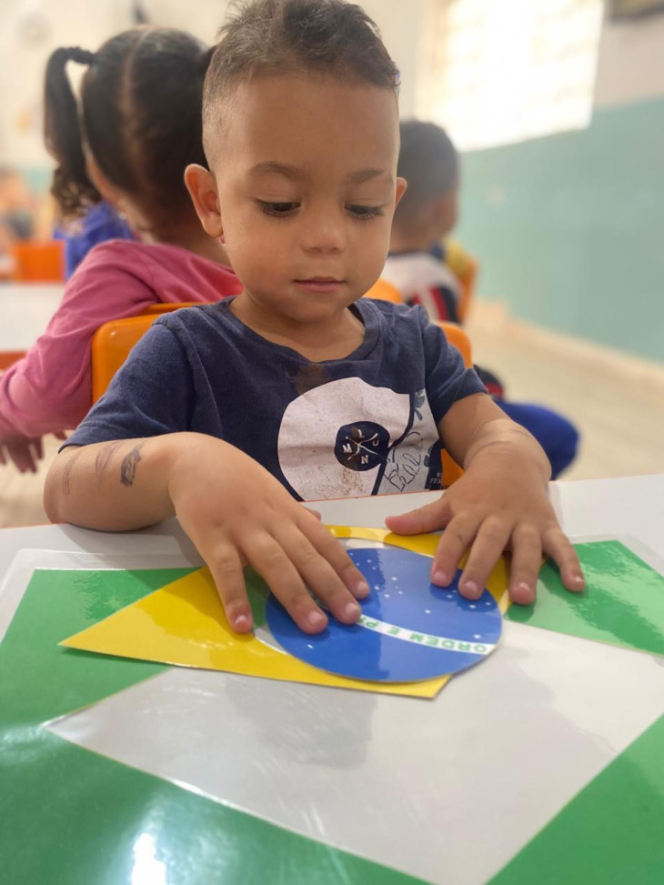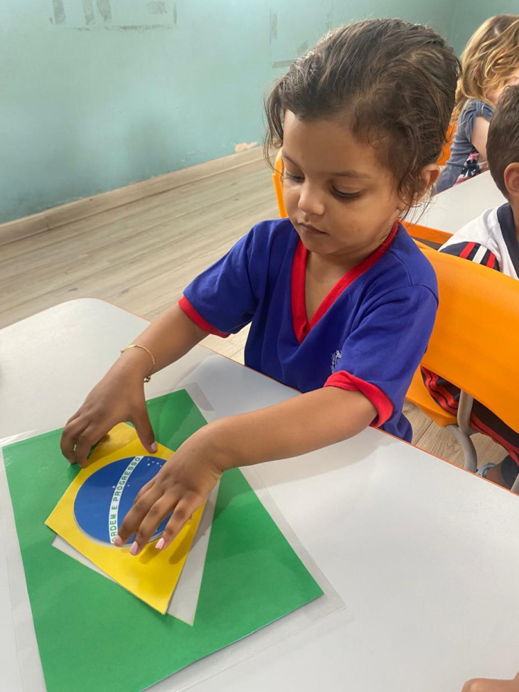 Exploraram também a bandeira do Brasil, conhecendo suas cores e formas, por meio de brincadeiras e atividades que estimularam tanto a coordenação motora quanto o desenvolvimento cognitivo. Foram propostas ações como pintura, colagem, rasgadura de papéis, entre outras, que contribuíram para o aprimoramento das habilidades manuais (EI02CG05).