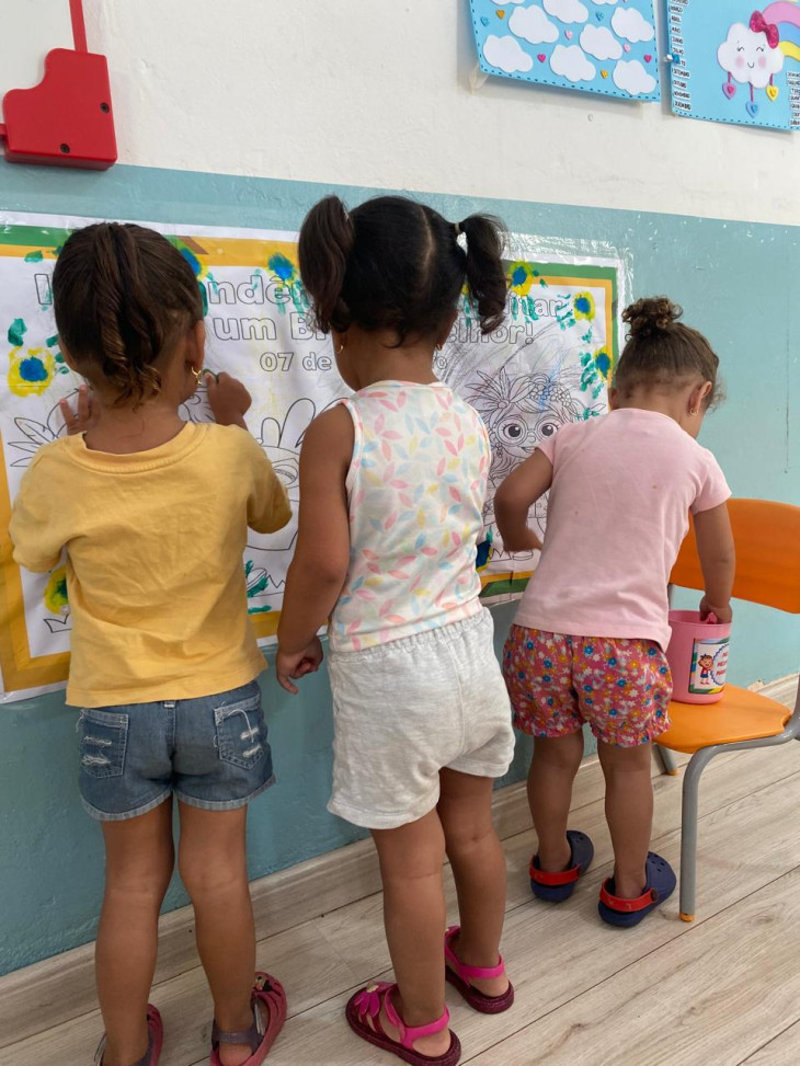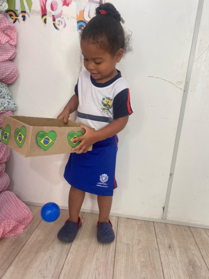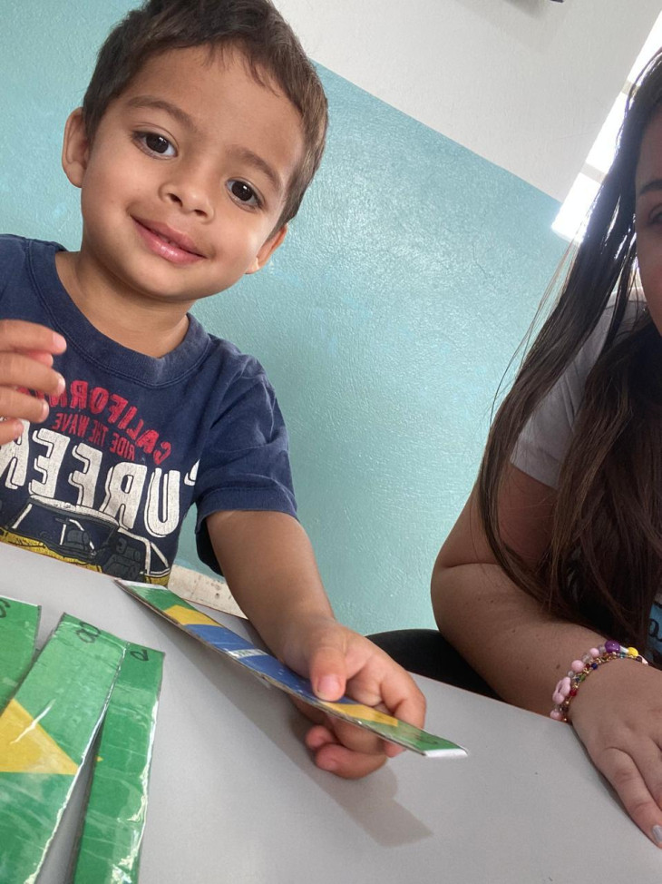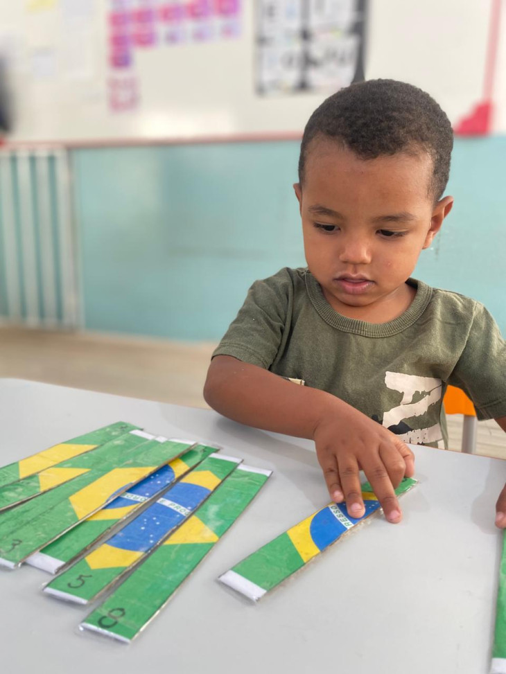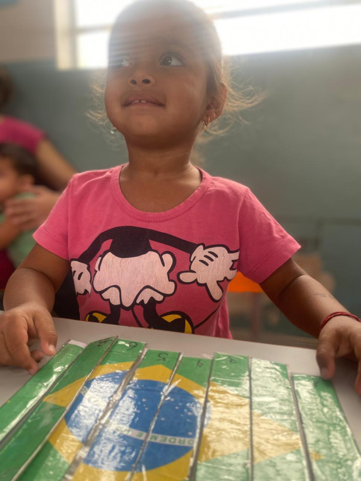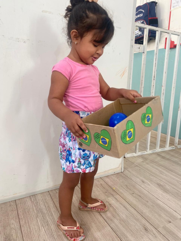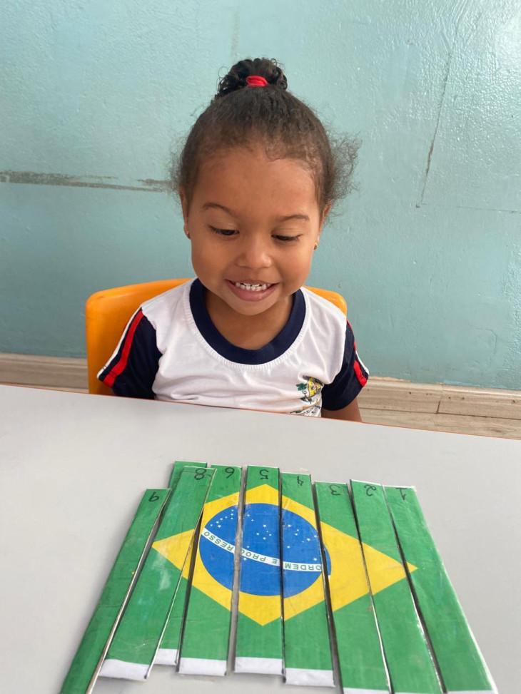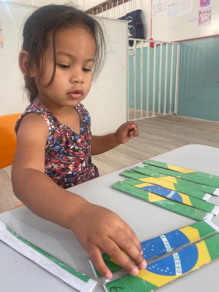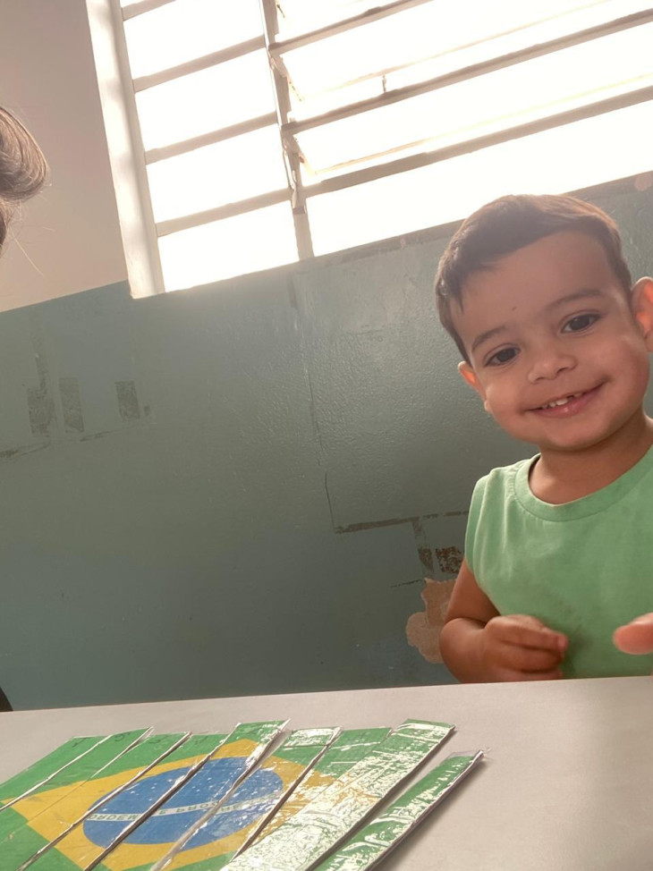 Exploraram também a bandeira do Brasil, conhecendo suas cores e formas, por meio de brincadeiras e atividades que estimularam tanto a coordenação motora quanto o desenvolvimento cognitivo. Foram propostas ações como pintura, colagem, rasgadura de papéis, entre outras, que contribuíram para o aprimoramento das habilidades manuais (EI02CG05).