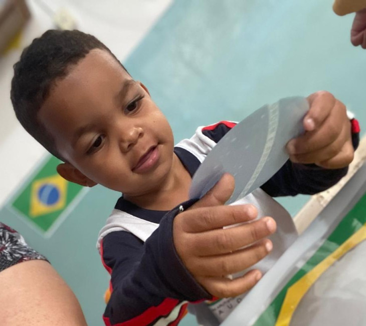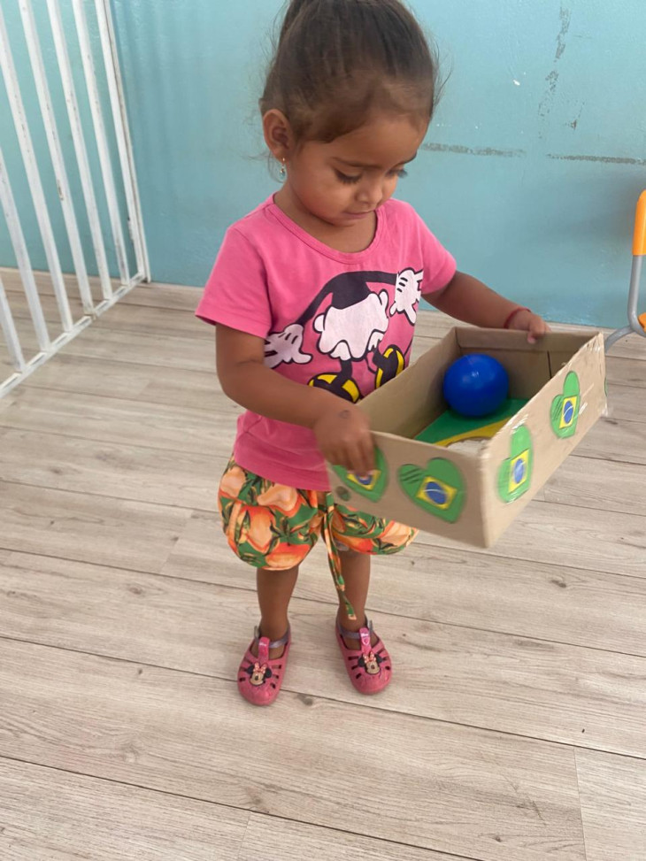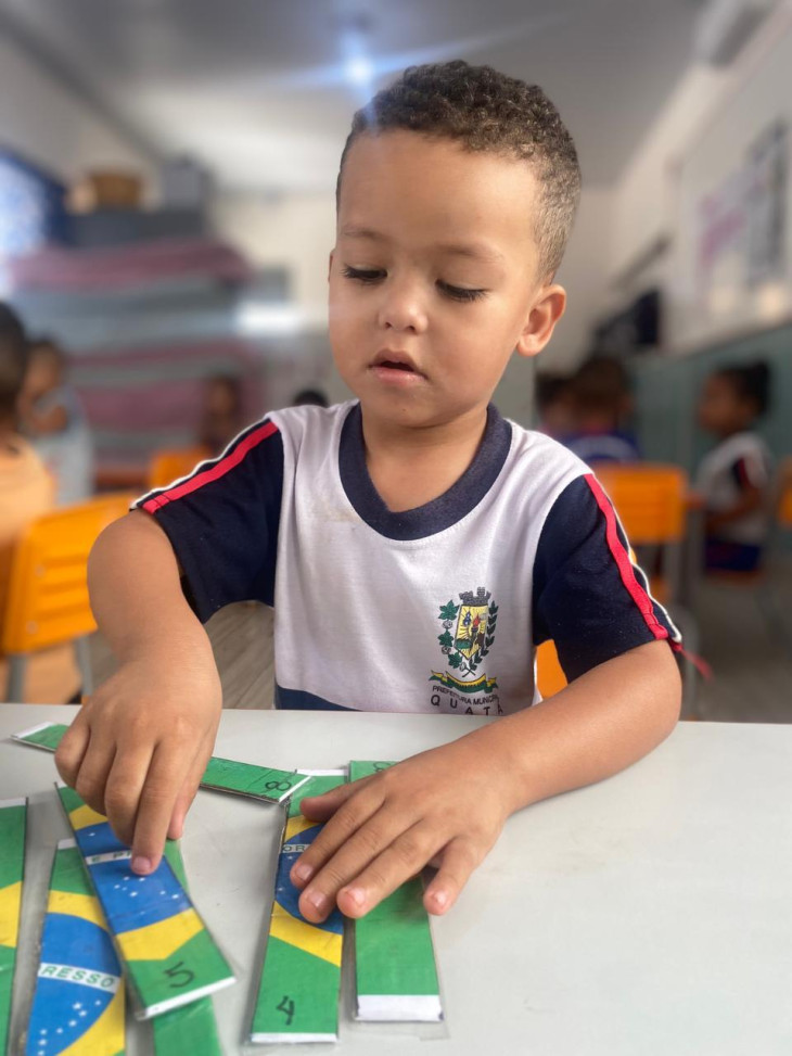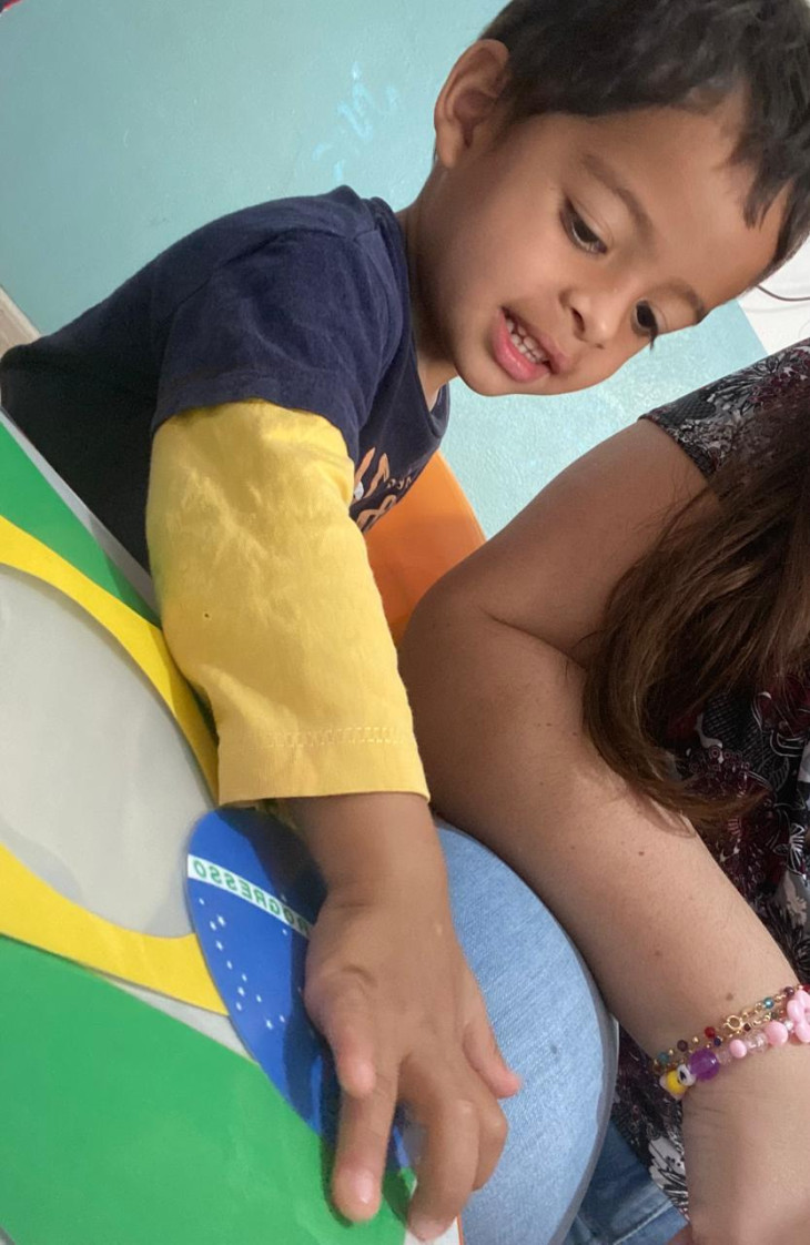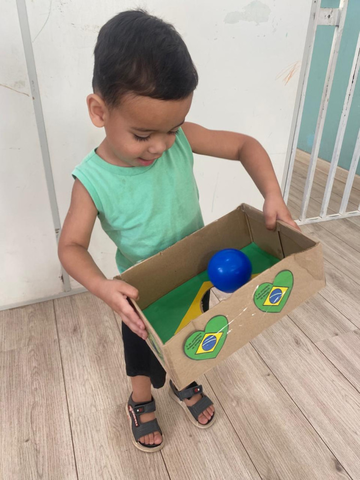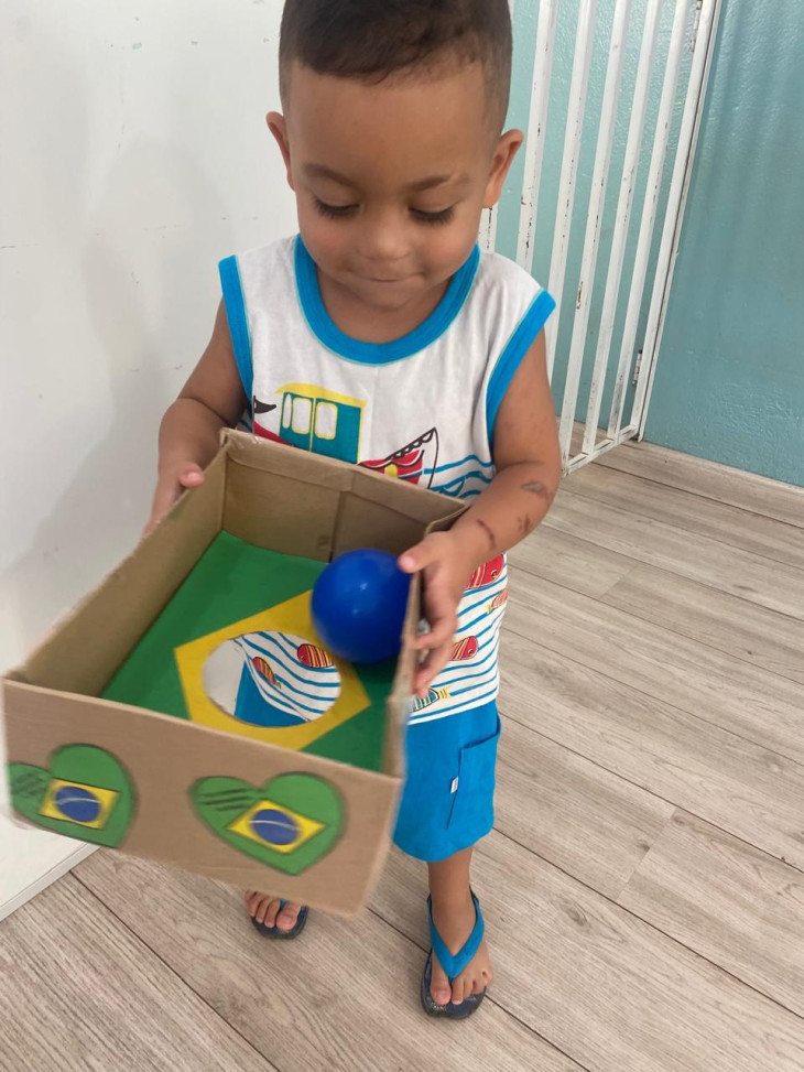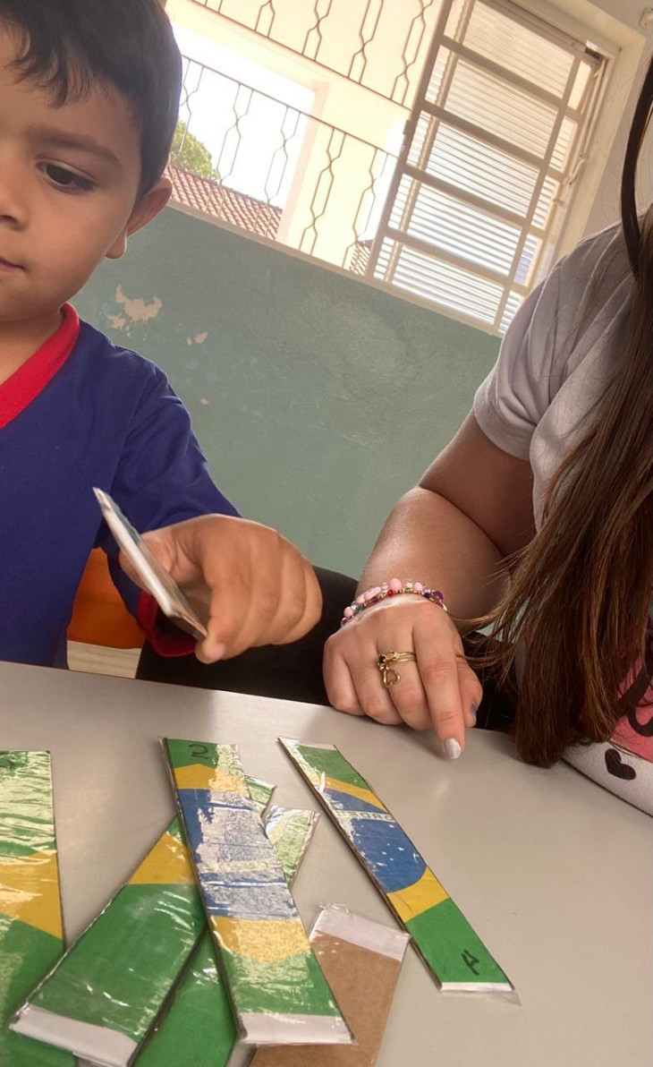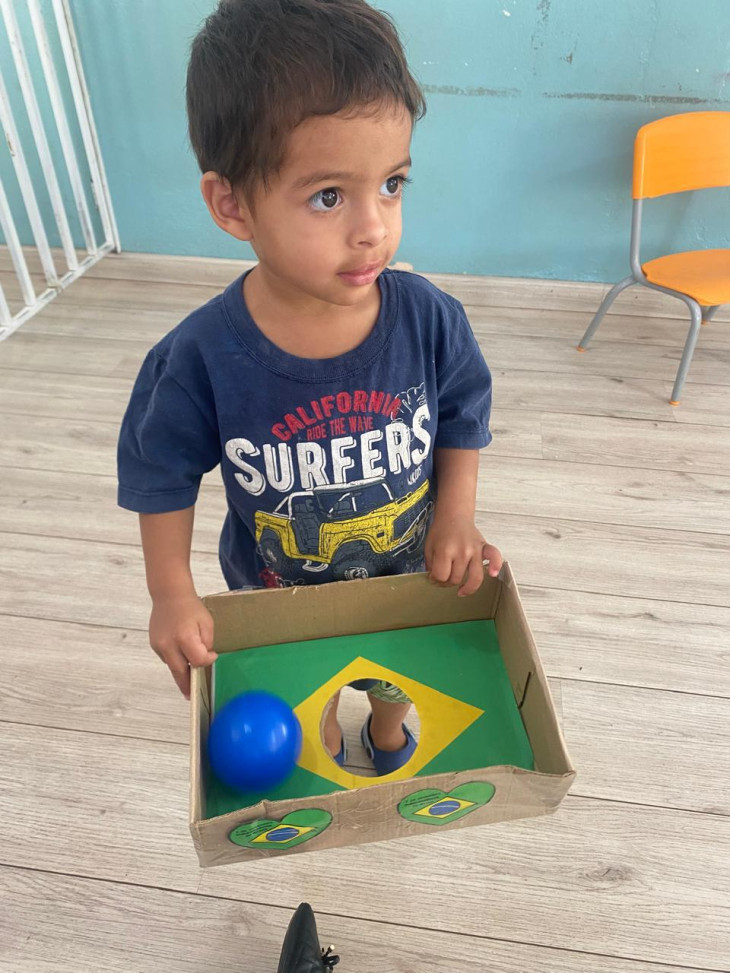 Exploraram também a bandeira do Brasil, conhecendo suas cores e formas, por meio de brincadeiras e atividades que estimularam tanto a coordenação motora quanto o desenvolvimento cognitivo. Foram propostas ações como pintura, colagem, rasgadura de papéis, entre outras, que contribuíram para o aprimoramento das habilidades manuais (EI02CG05).