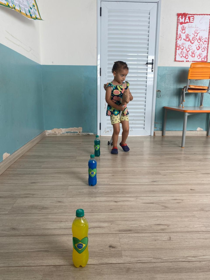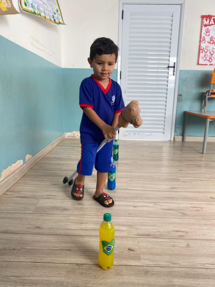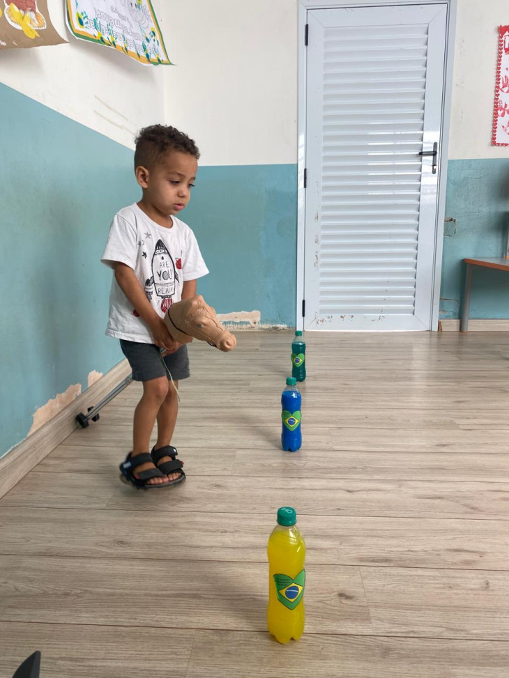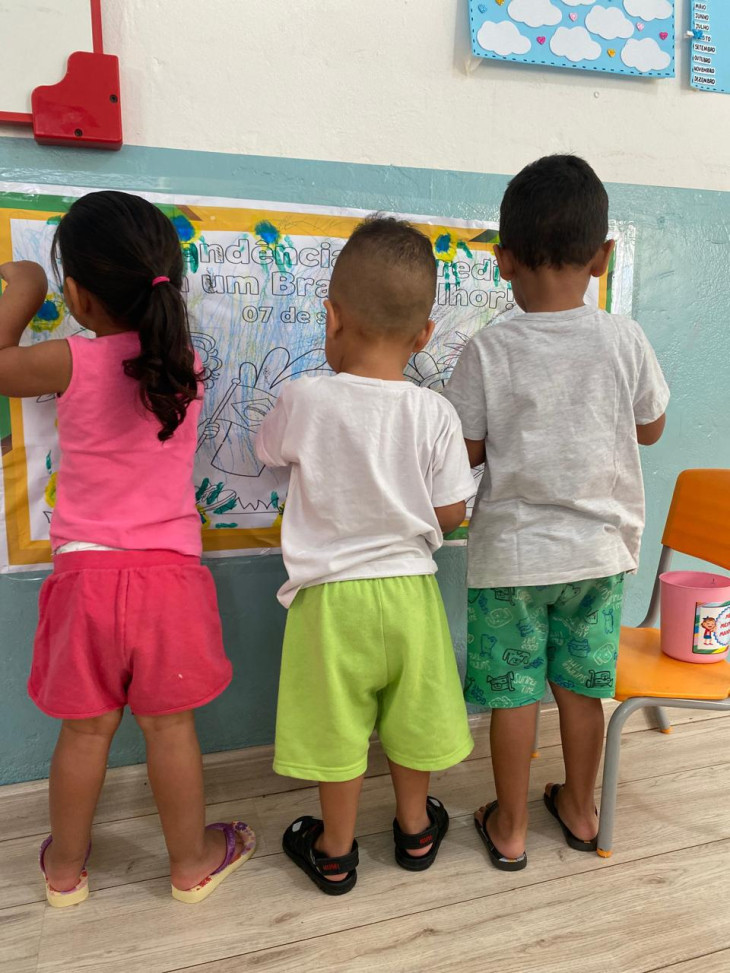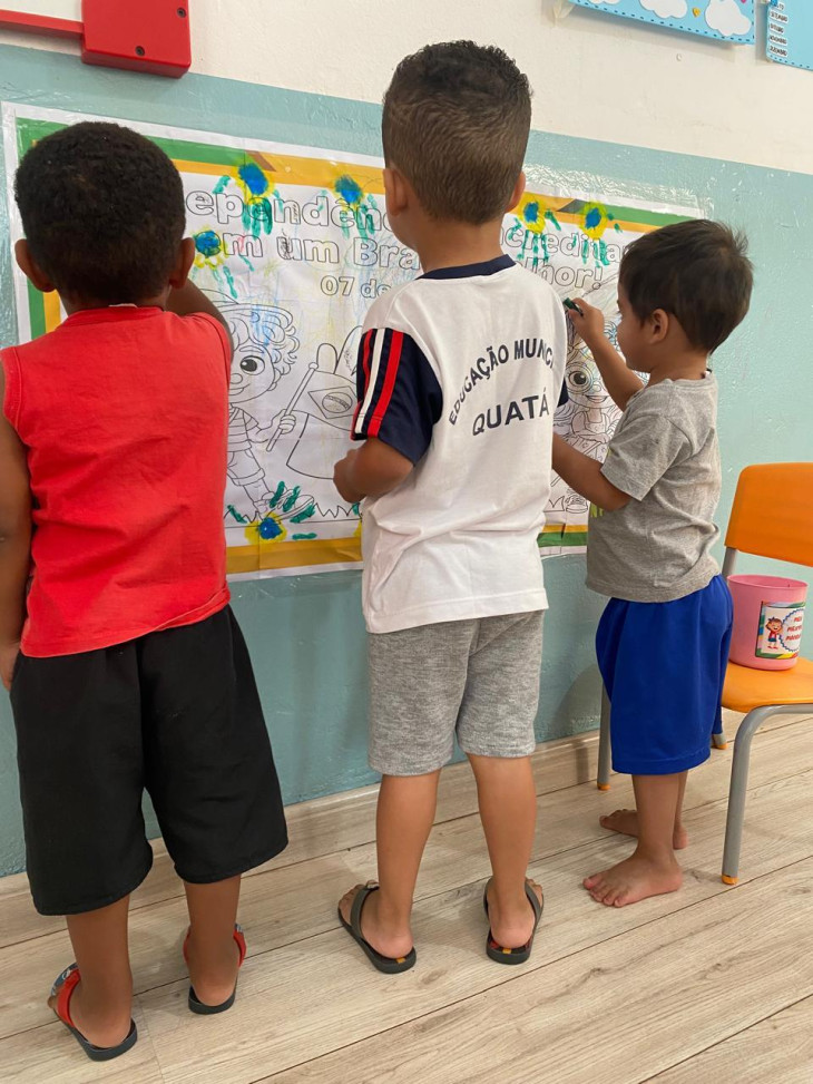 Além disso, a turma confeccionou um cartaz coletivo e pandeiros temáticos da Independência, vivenciando momentos de cooperação, socialização e respeito ao compartilhar materiais com os colegas (EI02EO03). As atividades também permitiram que as crianças se apropriassem de gestos e movimentos característicos da cultura brasileira, especialmente por meio das brincadeiras (EI02CG01).