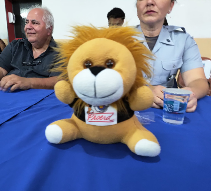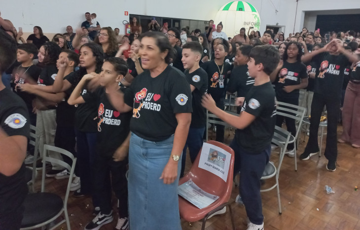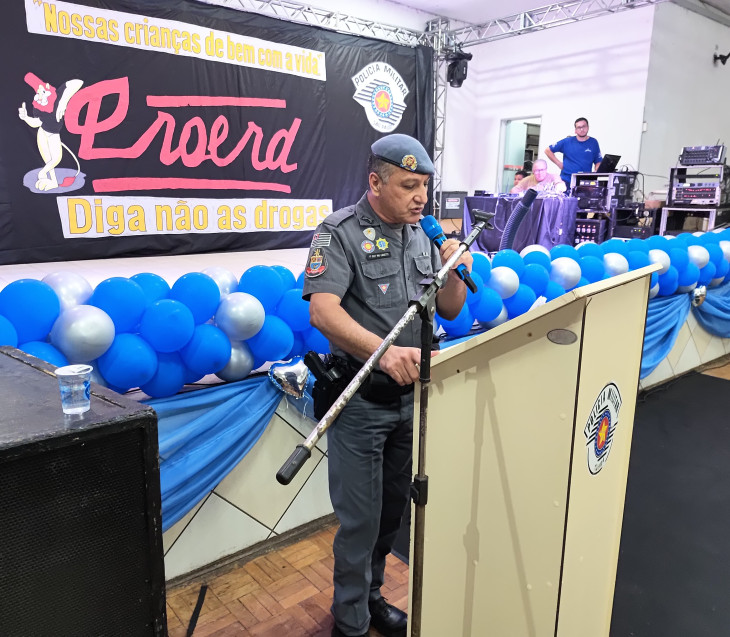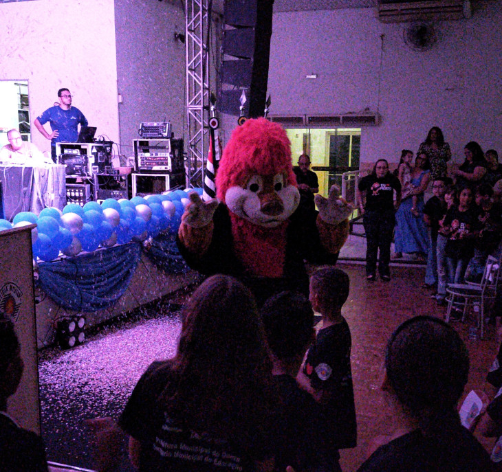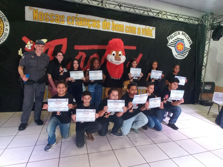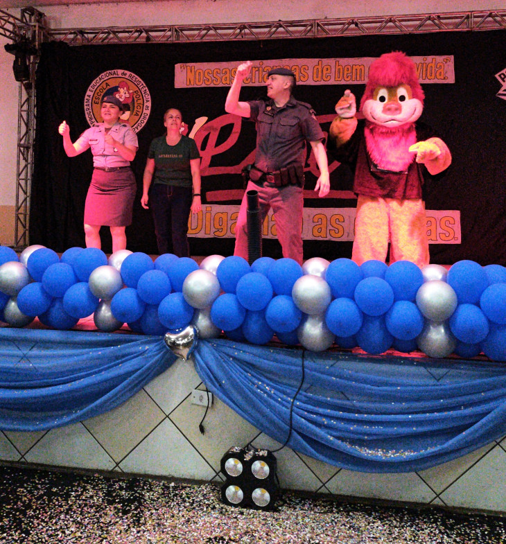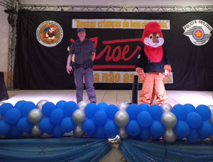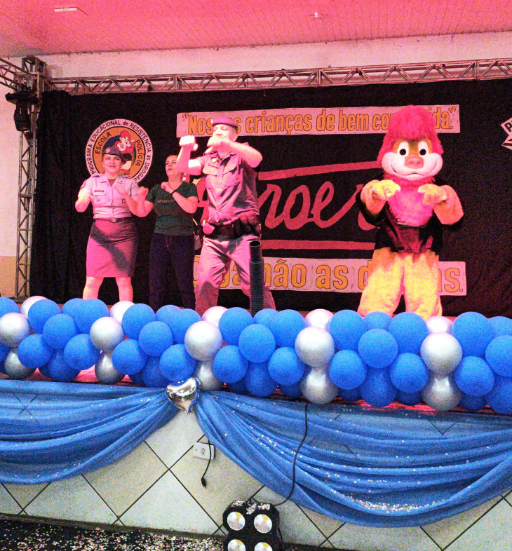 Ao final da cerimônia a mascote do PROERD fez presença junto aos policiais e crianças, que cantaram e dançaram o hino do Proerd.