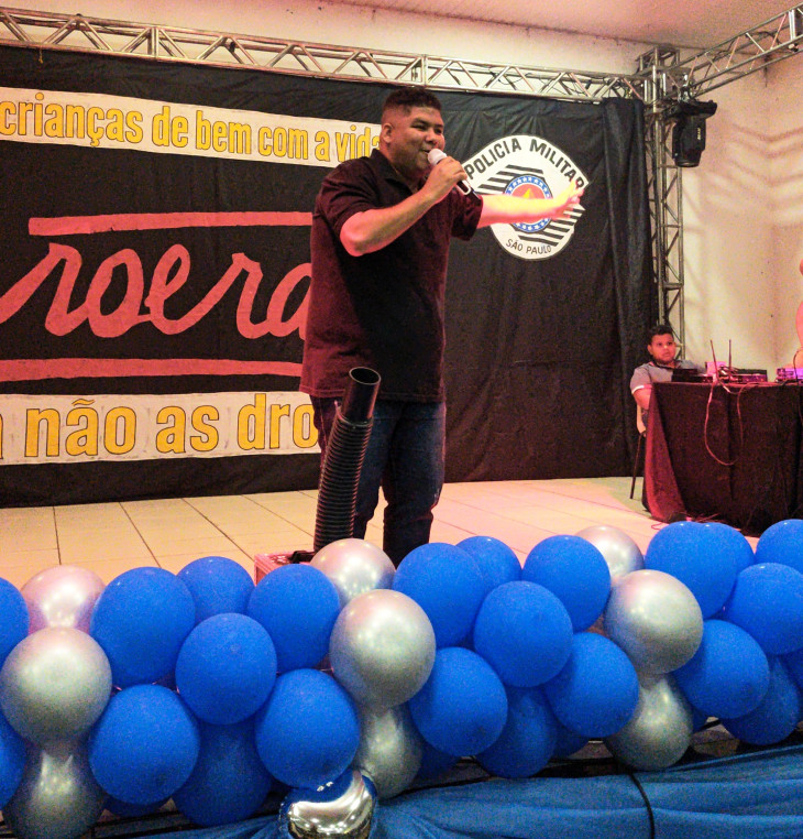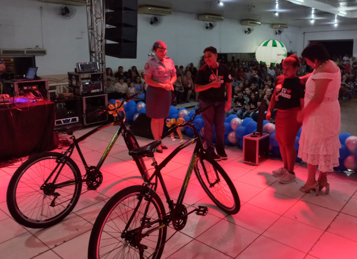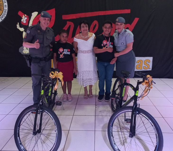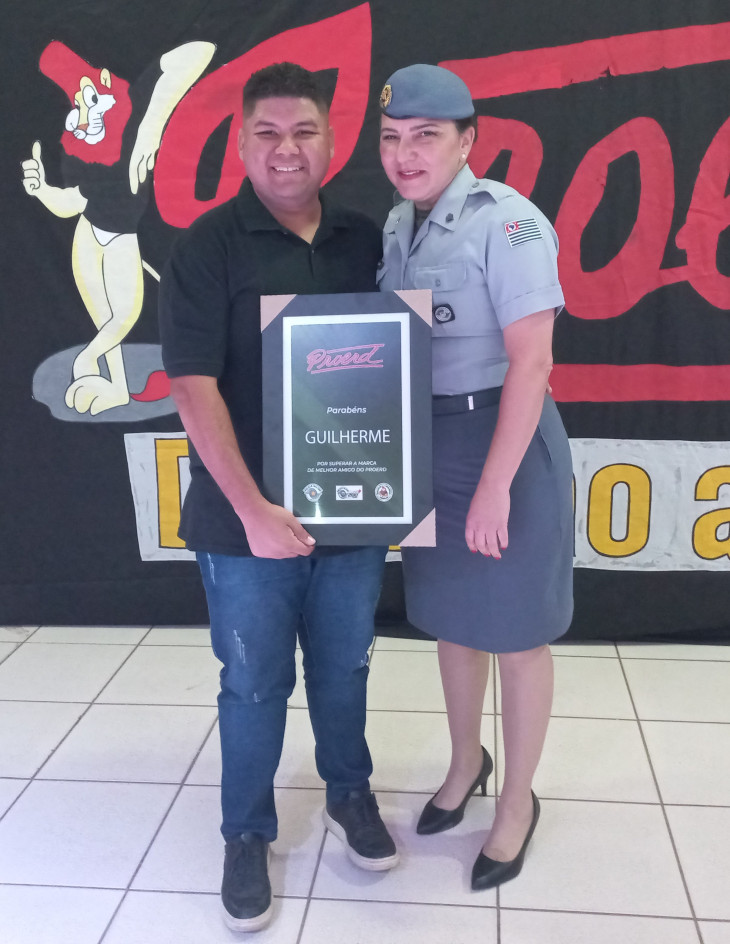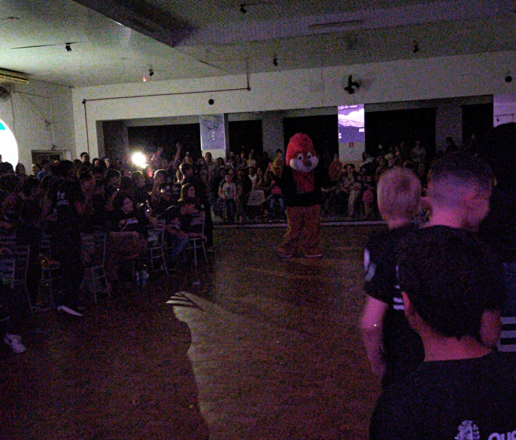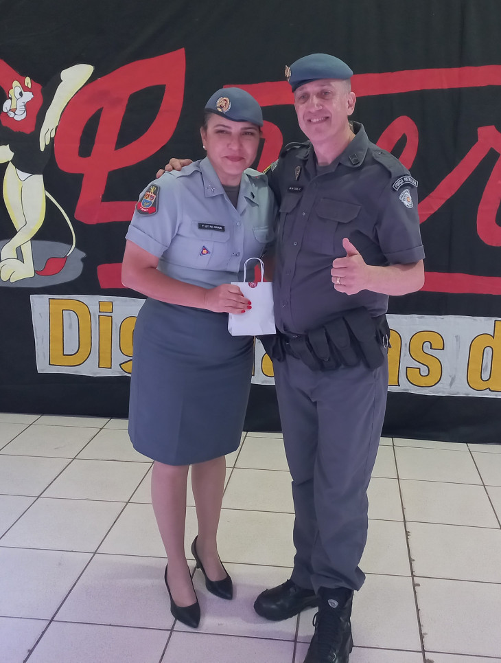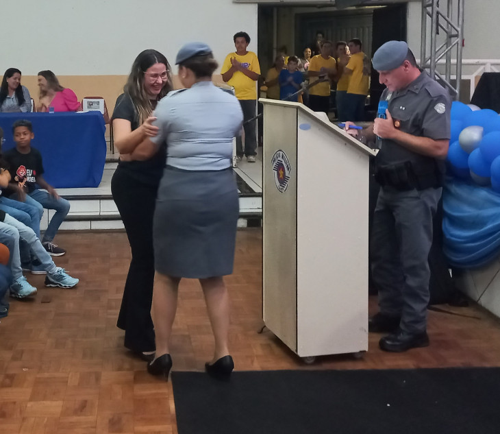 Ao final da cerimônia a mascote do PROERD fez presença junto aos policiais e crianças, que cantaram e dançaram o hino do Proerd.