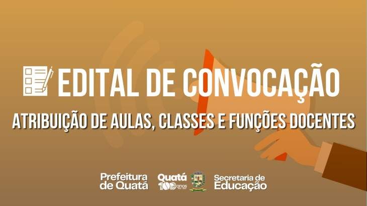 Edital de Convocação - Atribuição de Aulas, Classes e Funções DocentesLink do Edital: https://drive.google.com/file/d/1Ebah5XOwPu46Dm0zVG1VQT07hftgBLBz/view?usp=sharing#quata100anos