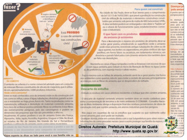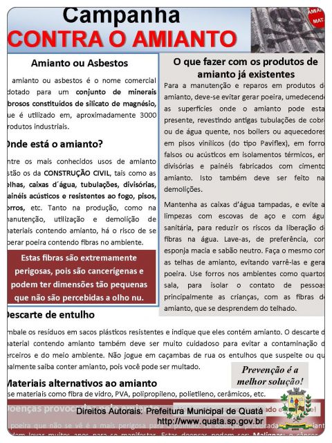 Qualquer dúvida, entre em contato direto com a VIGILÂNCIA SANITÁRIA DE QUATÁ para obter maiores informações de como proceder nesses casos e assim proteger sua família da exposição ao cancerígeno amianto.